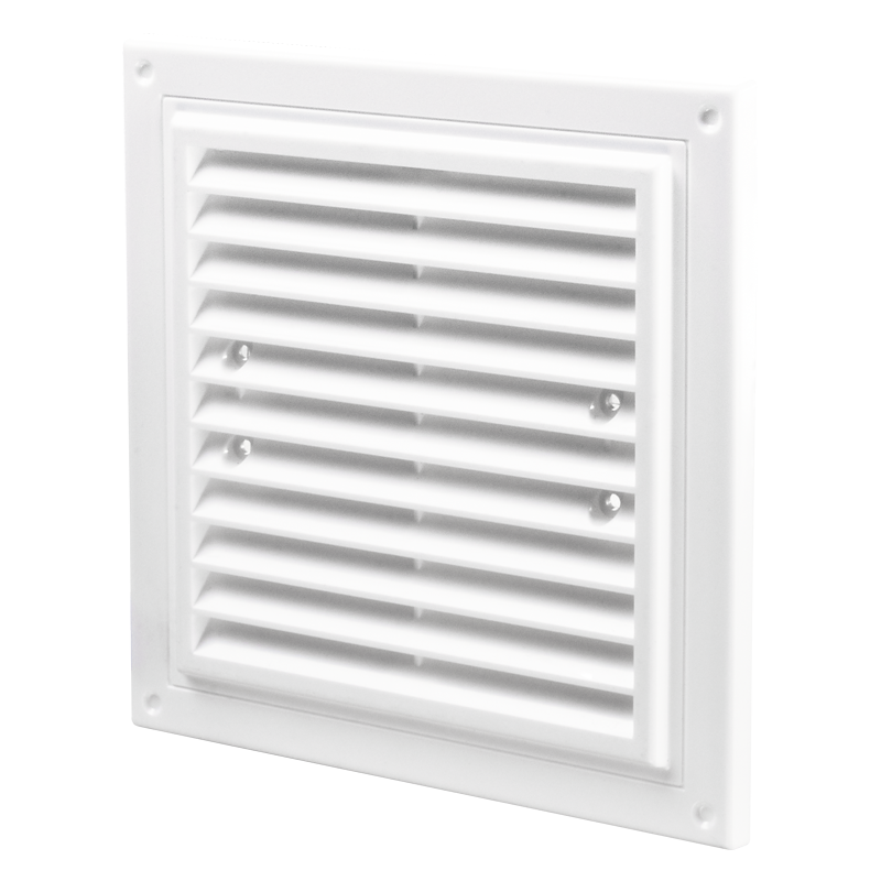 Пластмасова квадратна вентилационна решетка за декоративен дизайн, за управление на въздушния поток при вентилационни, климатични или отоплителни системи. Монтаж на стена или таван. Структура от един елемент. Може да се закрепя по няколко начин – с лепило/ силикон, с винтове.