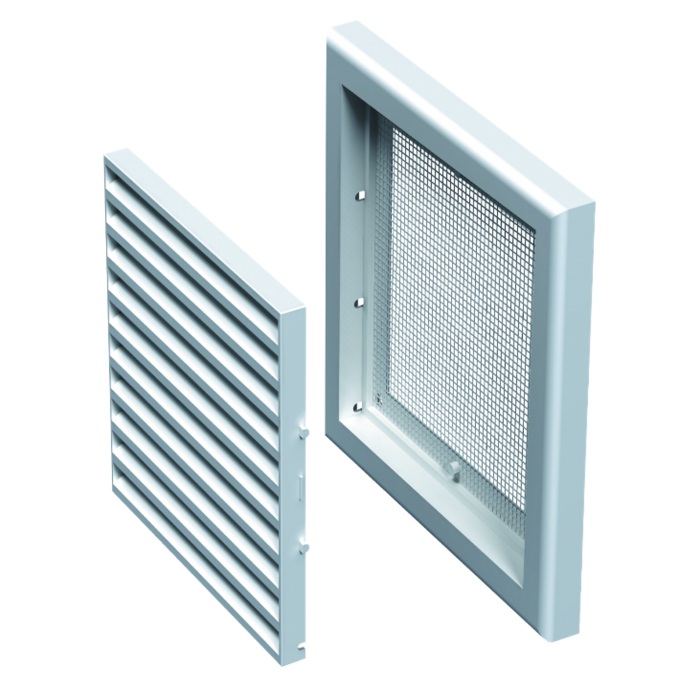 Пластмасова вентилационна решетка, за управление на въздушния поток при вентилационни, климатични или отоплителни системи. Монтаж на стена или таван, с мрежа против насекоми.