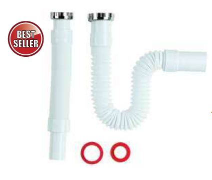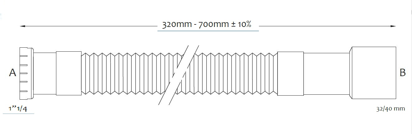 Гофрирана разтегателна връзка за сифони, мивки и др. с метална гайка. Може да се разтяга от 320 до 700мм. Цвят бял. Диаметър на входа 1“1/4 , а на изхода може да се избира от 32 и 40.
