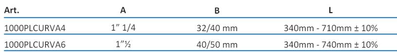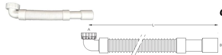 Гофрирана ъглова разтегателна връзка за сифони, мивки и др. с PVC гайка. Спестява място. Може да се разтяга от 340 до 710мм. Цвят бял. Диаметър на входа 1“1/4 , а на изхода е 32/40мм.