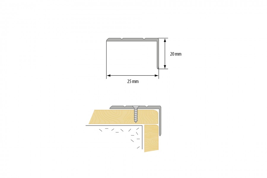 Този профил предпазва ръбовете на стъпалата, покрити с керамични плочки, дърво или ламинати. Набраздената му повърхност предпазва от подхлъзване. За открит монтаж. Предлага се в различни цветове. Дължина 0,90м, ширина 25х20мм.