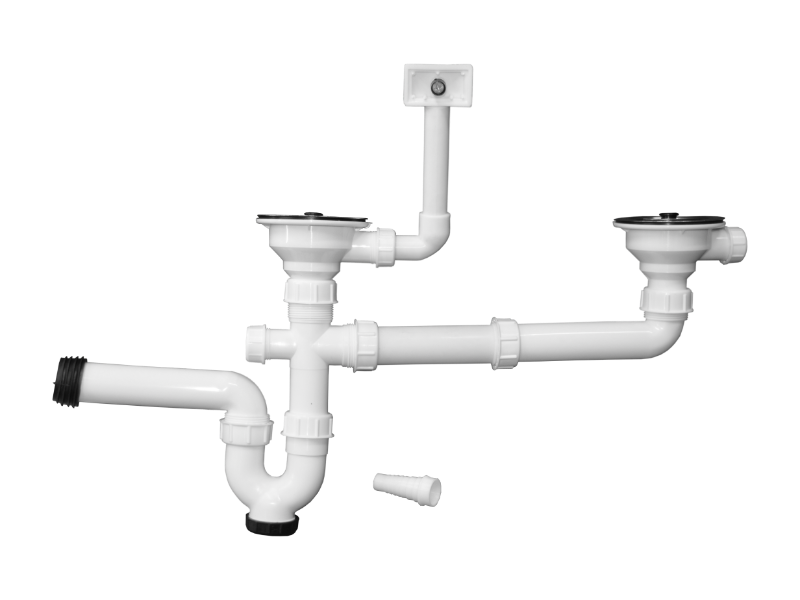 “S” образен сифон с един преливник за двукоритна мивка и с отклонение за пералня ф 90мм. /пластмасов. Предназначен е за монтиране към двукоритни мивки от неръждаема стомана, пластмаса и други материали, с отвор за преливник.