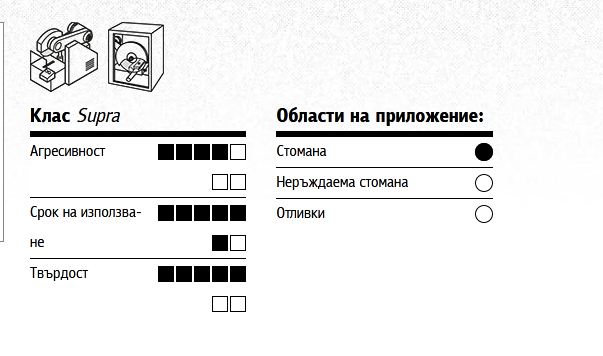 Предимства: Оптимална комбинация за употреба върху стомана – Може да се ползва и за неръждаема стомана – Добри показатели при рязане – Оптимален вариант при стационарни машини 3-5 kW
