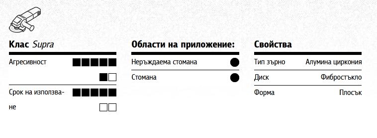 Използваните абразиви са разработени също и за употреба с високоскоростни ъглошлайфове (80 м/с) и са пригодени за широк спектър на приложение. Оптимизираното разположение на абразивните ламели осигурява висока производителност на шлайфане, дълъг срок на експлоатация и оптимално използване до края.Ламелите на платнена основа с циркониево, керамично или обикновено корундово покритие се разполагат равномерно върху дисковата подложка. Оптимизираните подложки гарантират шлайфане със свеж абразив по време на целия работен процес, като отнемането на материал остава винаги константно.