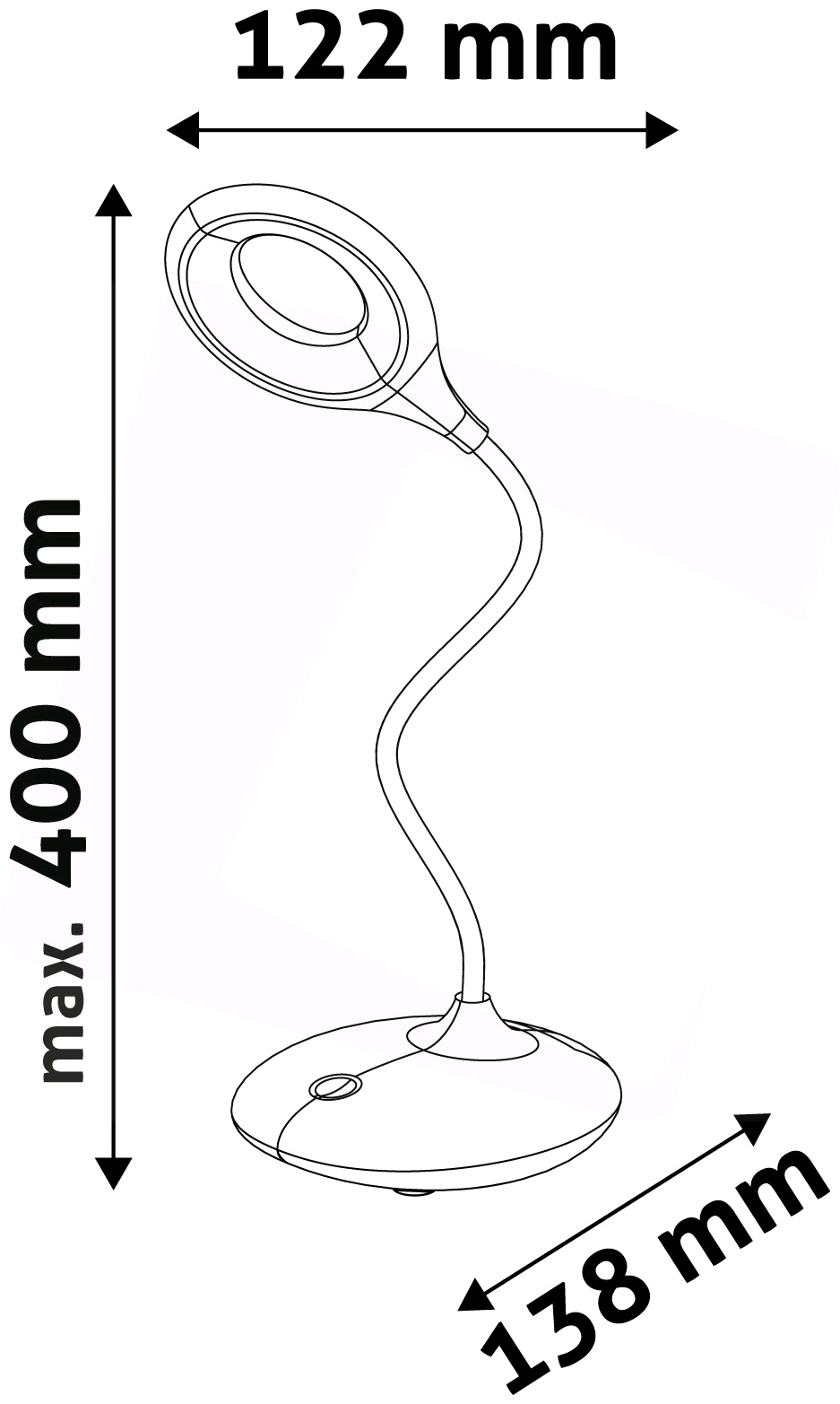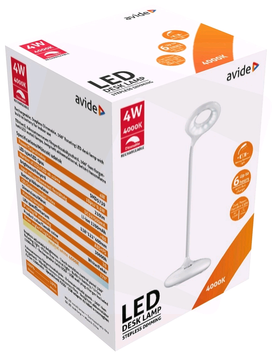 Презареждаема Led настолна лампа, с гъвкава основа, която позволява 360° освтление. Работи с вградена литиево йонна батерия 1200 mAh. Артикулът е с touch-система за включване и изключване, като има три нюанса на светлината – топла, студена и комбинирана.