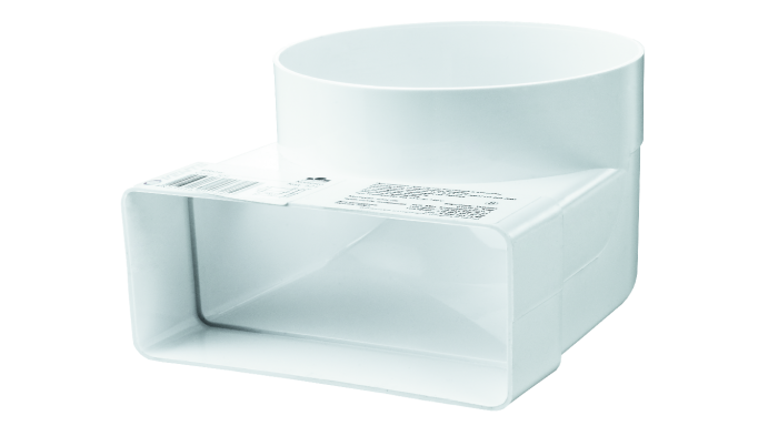 Предназначен за осъществяване на преход на 90° от кръгли въздуховоди с диаметър ф100 към плоски с размери 55×110 мм.