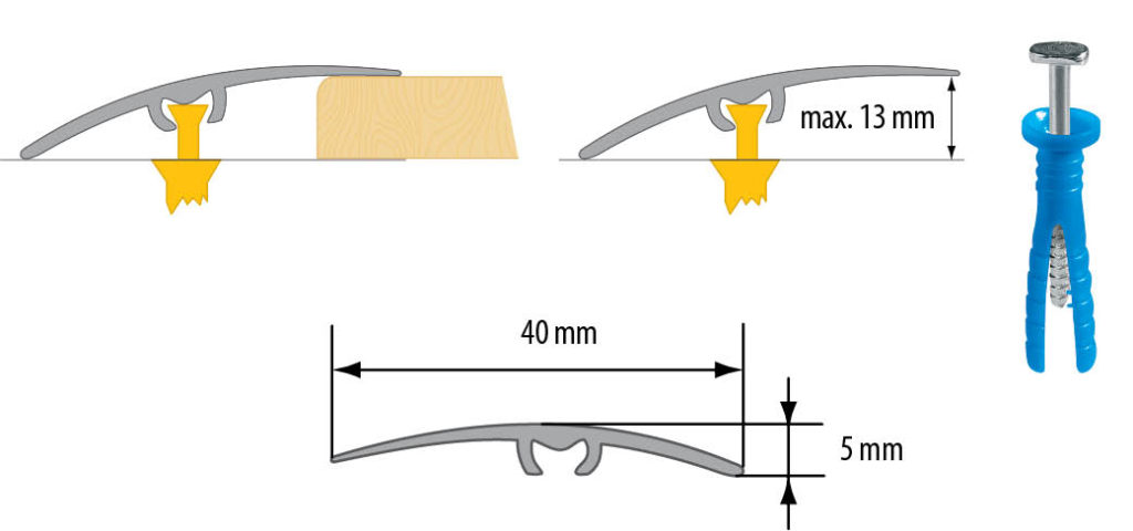 Преходът позволява плавно преминаване между различни подови настилки. Идеално решение за свързване на килими, мокети с паркет или теракота, защото изравняват възможните разлики в нивата. Безспорното предимство на този преход е невидим метод за монтиране към основата (с дюбели, включени в комплекта). Предлага се в различни цветове с дължина 1.8м и ширина 40мм.