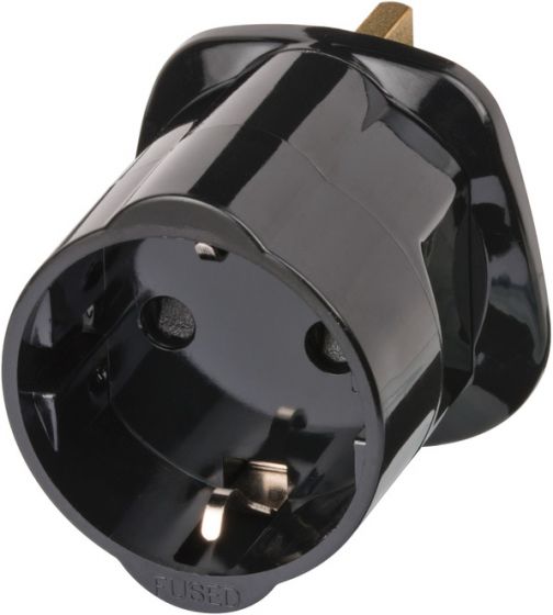 Преходен адаптер от контакт шуко към английски щепсел с 3 извода (пина). Позволява употреба на малки уреди със заземена, шуко контактна система на захранване в държави, които използват английски стандарт като UK, HK, UAE. ( Шуко => Англия). Контакт с детска защита.