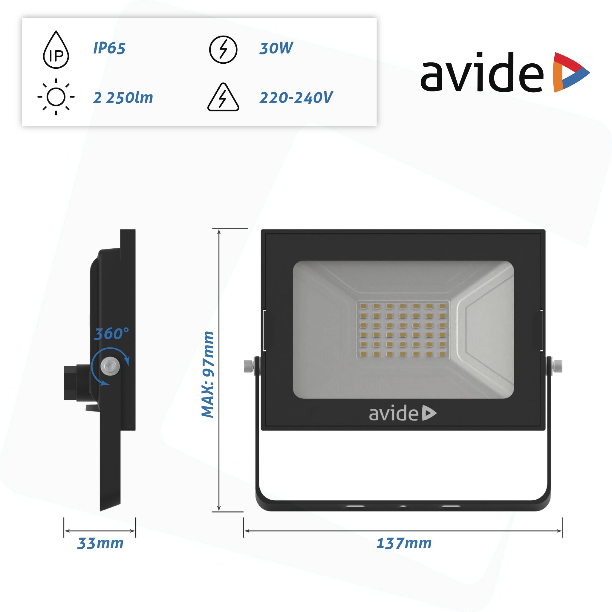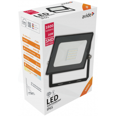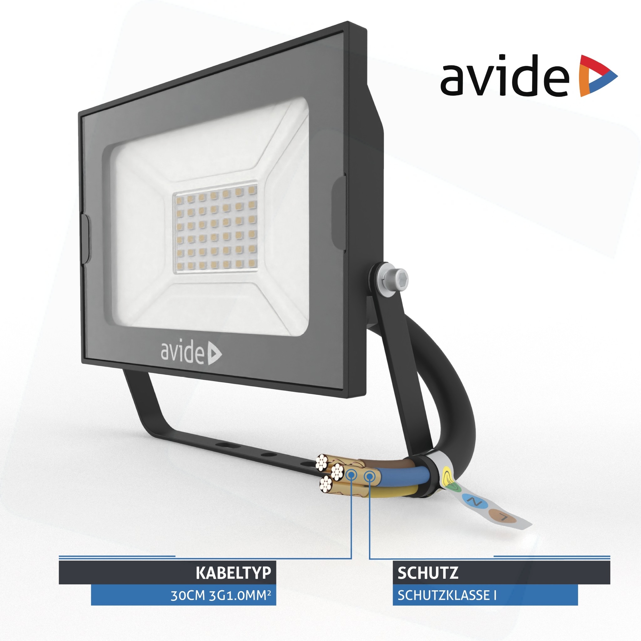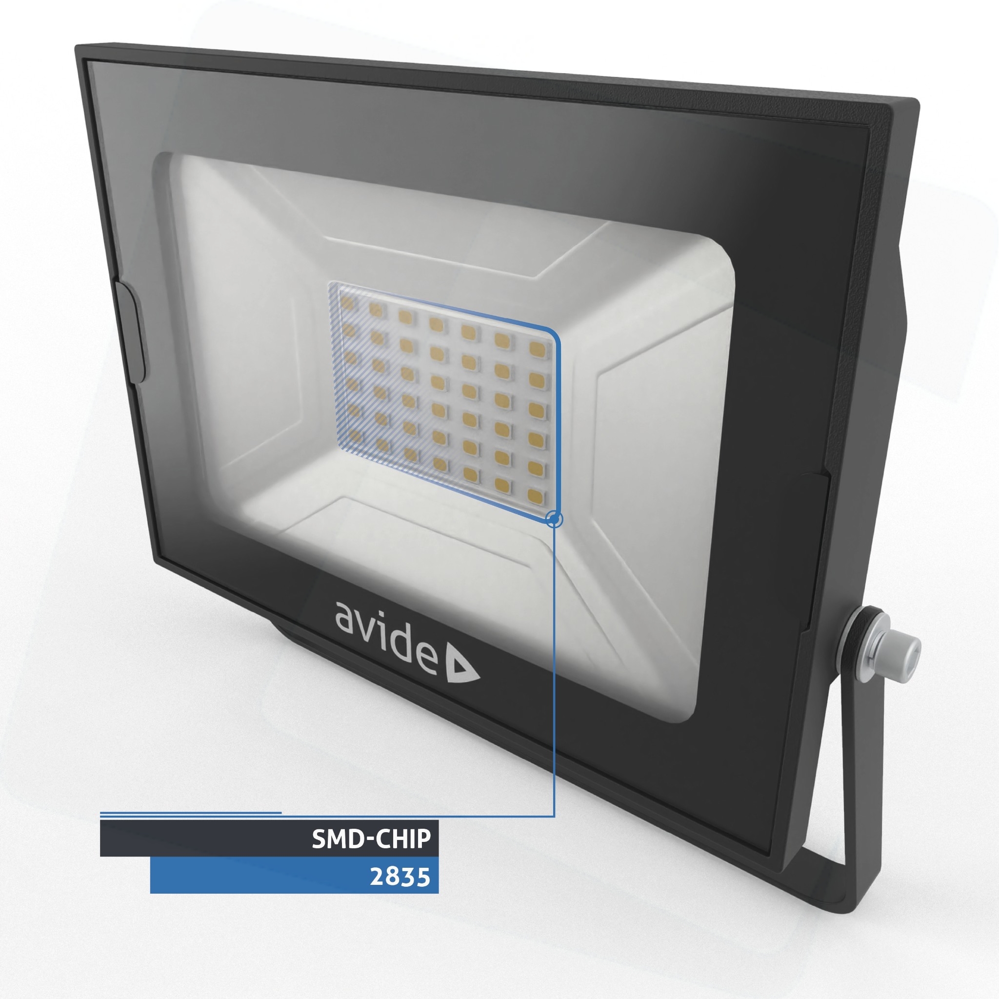 SMD LED прожекторите Avide могат да осигурят същатата мощност на осветление като традиционните халогенни лампи, но с много по-ниска консумация на електроенергия. LED прожекторите осигуряват до 20 пъти по-дълъг живот в сравнение с продукти, използващи традиционни крушки. Степента на влагозащита е IP 65, което ги прави идеални, за употреба на открито. На ръба на прожектора има подвижна метална рамка, така че можете да го фиксирате на земята, стената или дори тавана. След монтажа, ъгълът може да се регулира по всяко време, като по този начин ще се осигури светлина, от която се нуждаете, точно там, където имате нужда. LED прожекторите се продават с накрайник на кабела с дължина 30 см, а щепселът не е включен в комплекта! Продуктът може да бъде инсталиран само от професионалист! Всяка операция с включено захранване крие опасност от токов удар. Прожекторите Avide SMD се предлагат в неутрално бяло (NW).