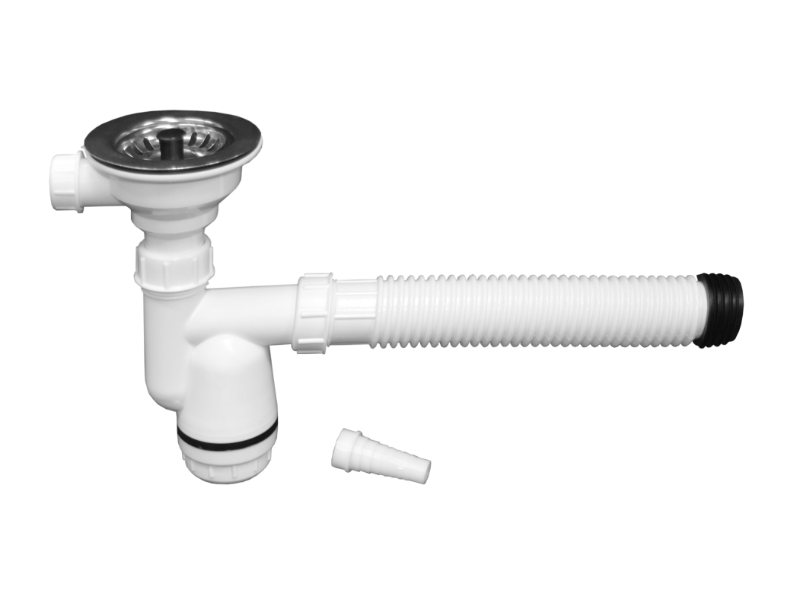 Сифон без преливник за мивка и с отклонение за пералня ф 90мм. /пластмасов/ 1 1/2″. Предназначен е за монтиране към мивки от неръждаема стомана, пластмаса и други материали, без отвор за преливник.