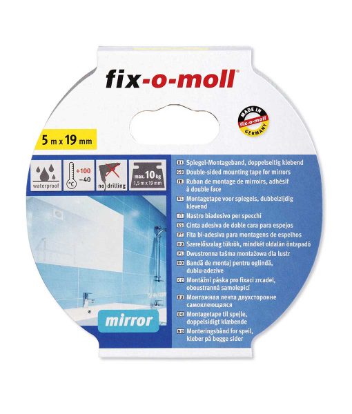 Двойнозалепваща лепенка за огледала 5 м на ширина 19 мм – с голяма товароносимост до 10 кг/1.5 м. Приложима в домакинството за двустранно, супер трайно и здраво залепване, на закрито за монтаж на огледала и други предмети с гладка основа, напр. табели,  към гладки повърхности като плочки, метал или пластмаса (твърда). Супер монтажната лепенка е водоустойчива, както и устойчива в температурния диапазон -40°/+100°. За залепване на предмети с голяма повърхност като огледала се препоръчва тройно подсигуряване или 1 кг/ 15 см монтаж лепенка (в горната част на огледалото да се сложи два пъти повече лепенка, отколкото в долната част). След притискане не може повече да се коригира, като при тежки предмети достига максимална залепваща сила след 24 ч. Основата, върху която се лепи, трябва да бъде чиста, суха и без мазни участъци (да се почиства). Лентите се лепят по вертикала и при  при температура над 10°, а цвета е бяло.