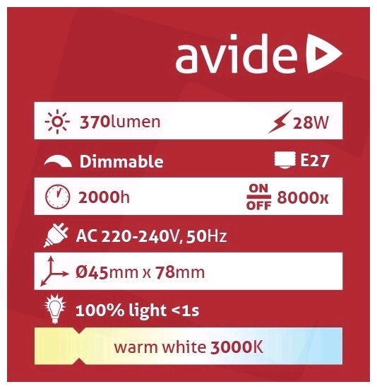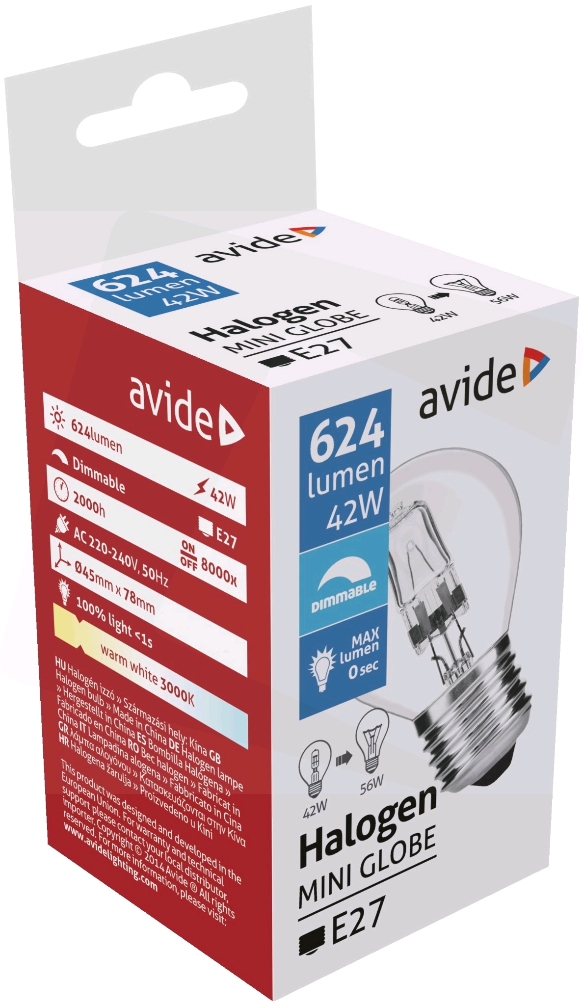Димеруема халогенна крушка тип мини балон е27 на фирма Avide, светеща с топла светлина (3000К). Крушките с халогенна капсула предоставят повече светлина за по – продължителен период от време, отколкото крушките с нажежаема жичка – 2 000 часа живот. Тяхното потребление на енергия е с 30% по-малко в сравнение с традиционните – крушката изразходва 28W/42w*, а свети като 38w/56w* обикновена такава.