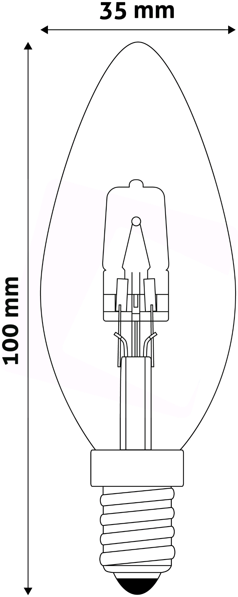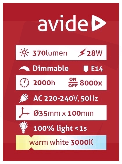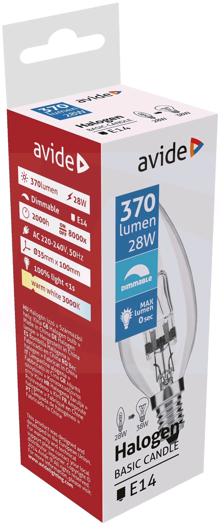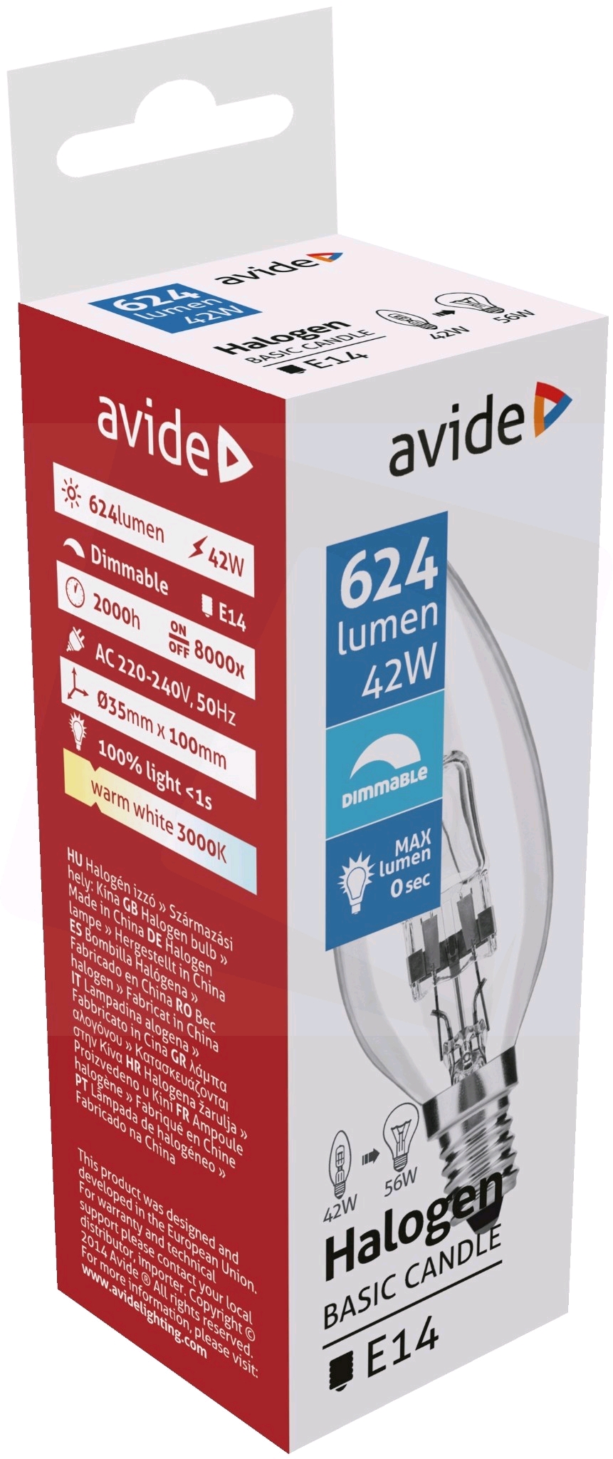 Димеруема халогенна крушка тип свещ е14 на фирма Avide, светеща с топла светлина (3000К). Крушките с халогенна капсула предоставят повече светлина за по – продължителен период от време, отколкото крушките с нажежаема жичка – 2 000 часа живот. Тяхното потребление на енергия е с 30% по-малко в сравнение с традиционните – крушката изразходва 28W/42w*, а свети като 38w/56w* обикновена такава.