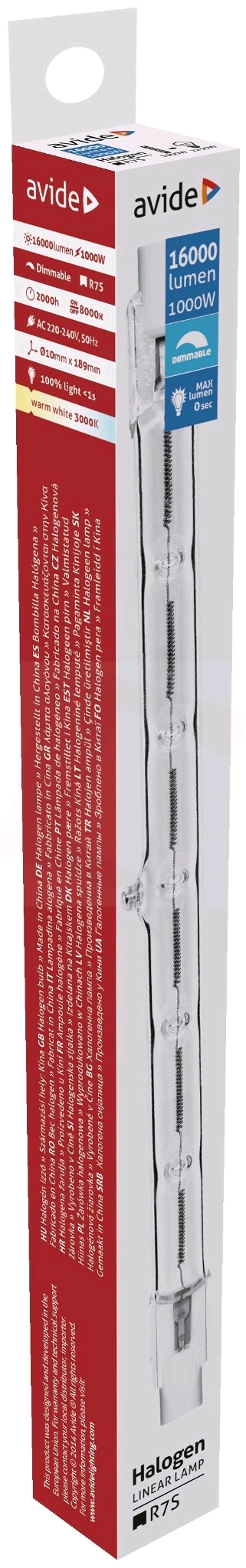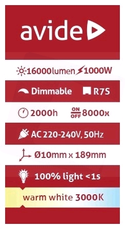 Халогенна крушка тип R7s на фирма Avide, светеща с топла светлина (3000К). Крушките с халогенна капсула предоставят повече светлина за по – продължителен период от време, отколкото крушките с нажежаема жичка – 2 000 часа живот. Тяхното потребление на енергия е с 30% по-малко в сравнение с традиционните – крушката изразходва 1000W, а свети като 1250W обикновена такава.