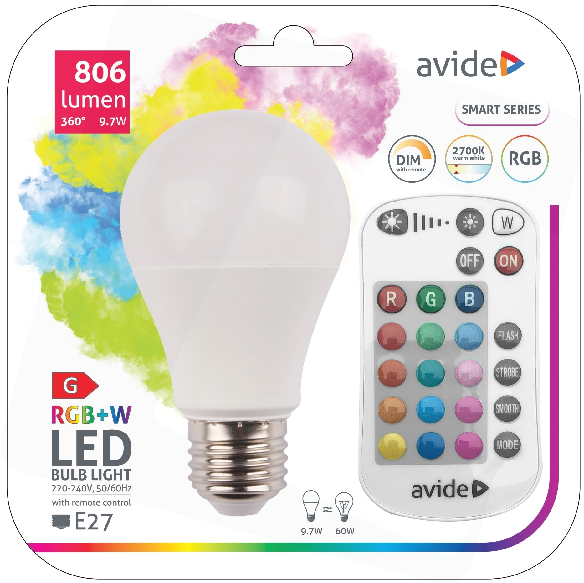 Продуктът е подходящ както за създаване на настроение (чрез светене в различни цветове), така и за използване като основна светлина. С помощта на дистанционното може да изберирате желания цвят (червен, син, зелен, жълт), както и да зададете топла бяла (2700 K) светлина. Едно дистанционно може да се използва за управление на няколко, дори различни форми на LED крушките Avide, едновременно. Чрез него, може, както да се включва и изключва, така и да се настройват различнн светлинни ефекти. Дистанционното работи с 1 батерия тип CR2025, включена в комплекта. Моля, обърнете внимание, че пластмасовото защитно фолио на батерията трябва да се отстрани преди употреба.