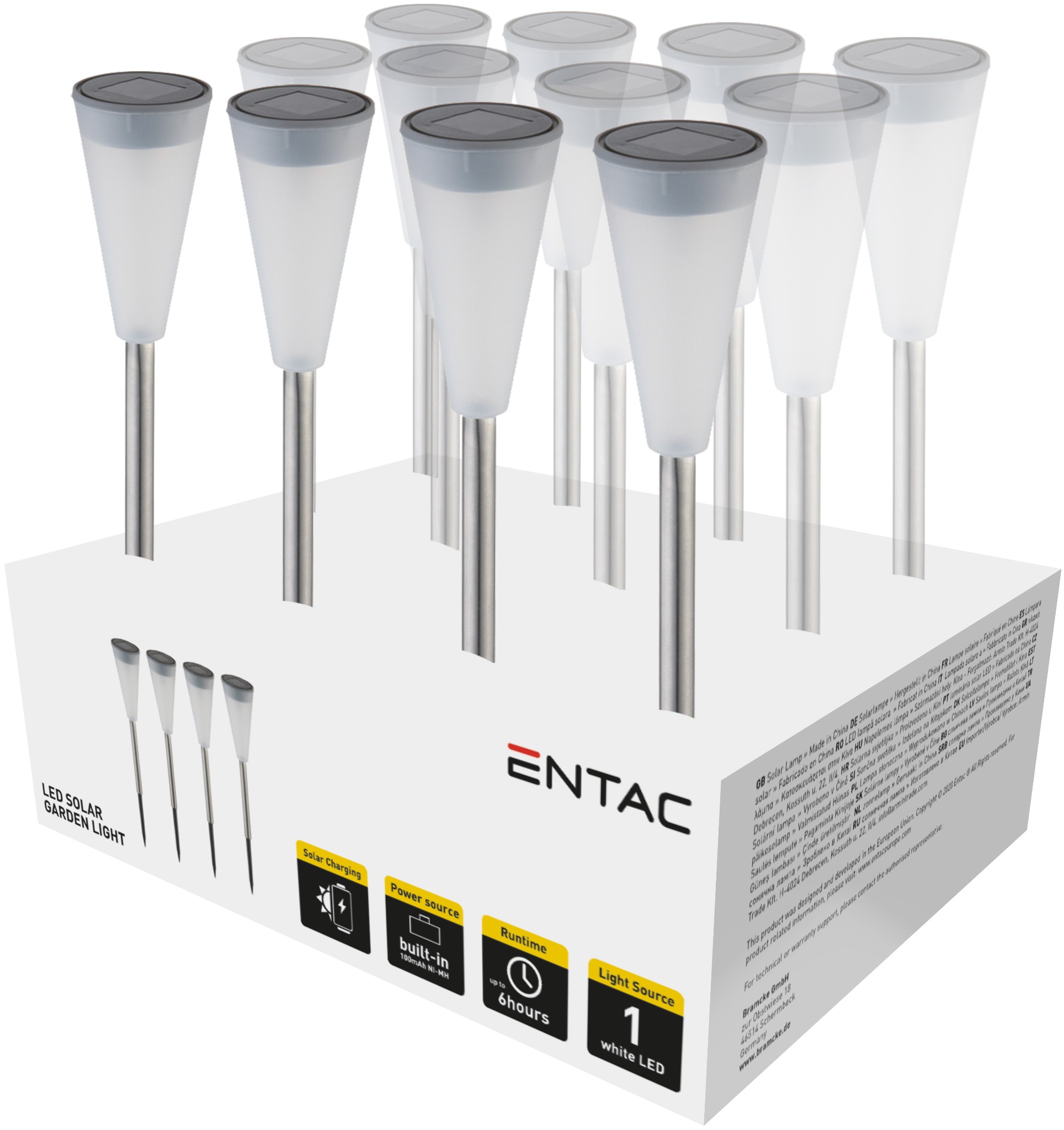 Соларните лампи от Entac са подходящи, както за градина, така и за входове на гаражи. Благодарение на възможността за соларно зареждане, те предлагат енергийно ефективна и достъпна опция, за осветление. Продуктът е с височина от 38 см. Лампите работят с вградена батерия Ni-MH 1.2V 100mAh.