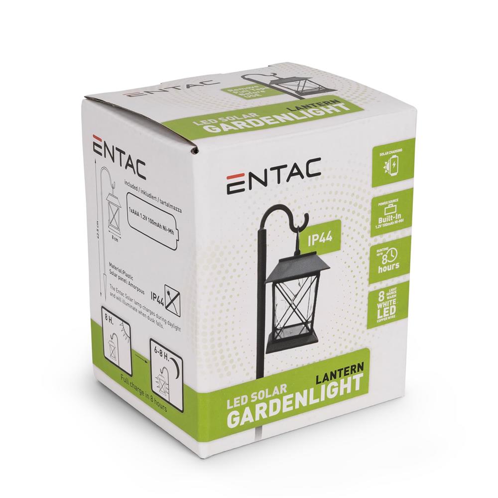 Соларните лампи от Entac са подходящи, както за градина, така и за входове на гаражи. Благодарение на възможността за соларно зареждане, те предлагат енергийно ефективна и достъпна опция, за осветление. Лампите работят с вградена батерия Ni-MH 1.2V 100mAh, AAA