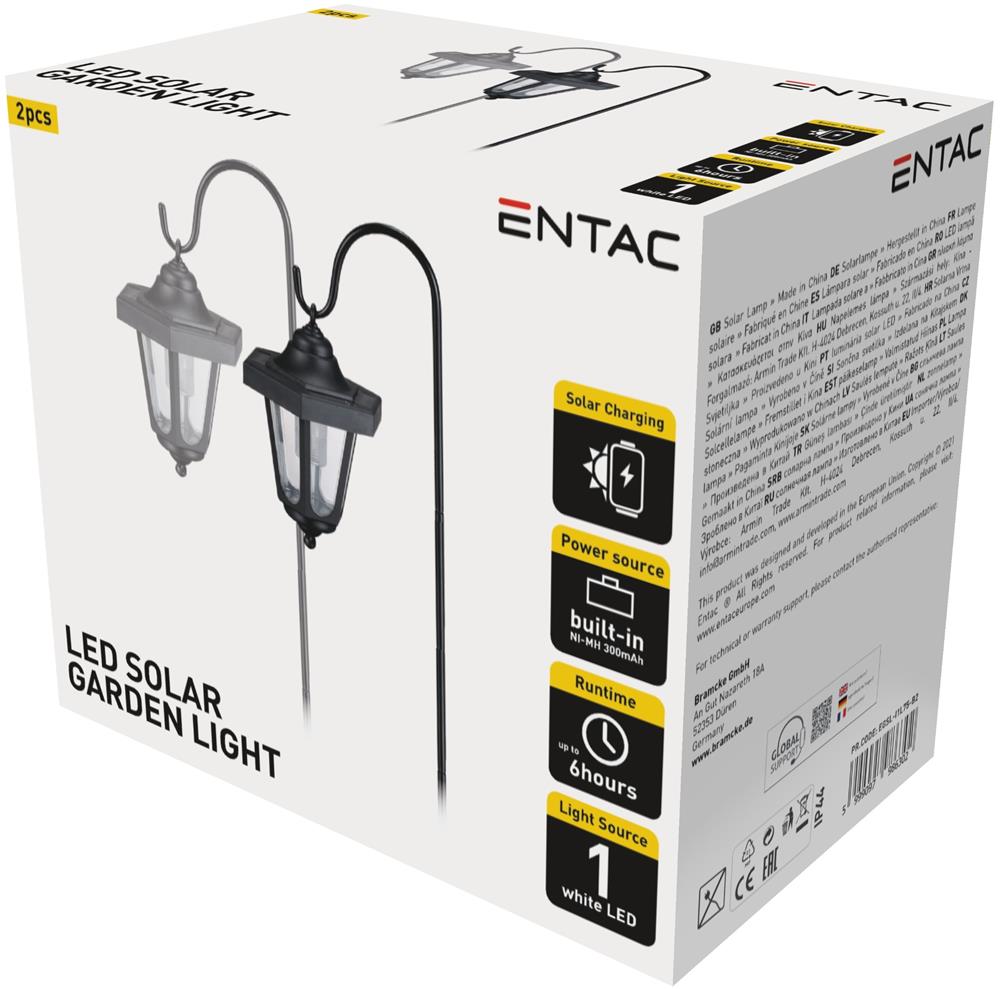 Соларните лампи от Entac са подходящи, както за градина, така и за входове на гаражи. Благодарение на възможността за соларно зареждане, те предлагат енергийно ефективна и достъпна опция, за осветление. Лампите работят с вградена батерия Ni-MH 300mAh, AA. Цената е за брой. Опаковани са по 2 бр.